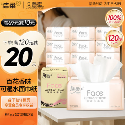 洁柔抽纸 粉Face柔韧3层120抽*27包 面巾纸百花香可湿水原生木浆整箱
